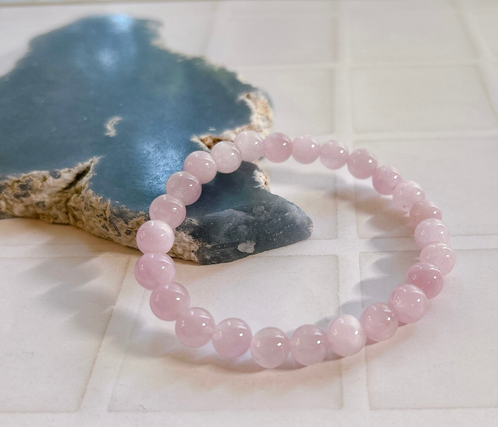 このブレスレットは「ハートと思考をつなぐ石」とされるクンツァイトです。