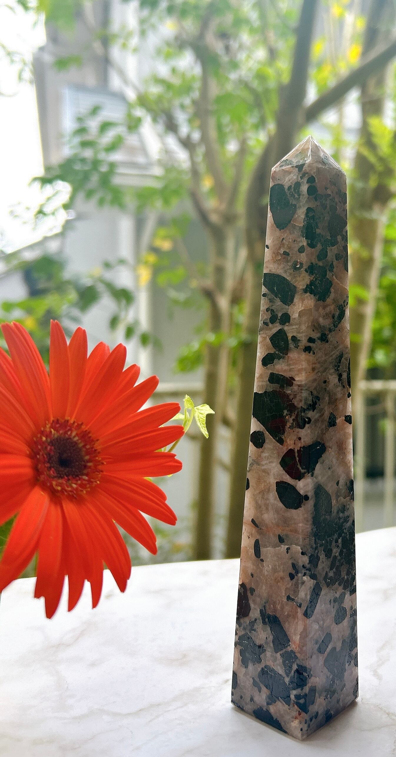 こちらの石は、ピンクベージュのクォーツ部分と大小様々なトルマリンのブラックの模様がとても美しく、存在感のある個体です。お部屋に置いておくだけで、その場のエネルギーを変えてくれる感覚があり、気品のある雰囲気を醸し出してくれます。